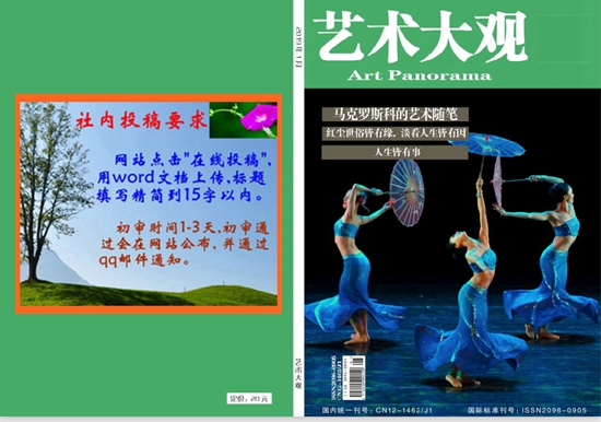 《艺术大观》杂志致力于人文、艺术理论与实践的新发现、新突破,竭诚为各人文艺术科研机构、高中等院校、管理部门的艺术、科研、管理人员服务,为其总结实践经验、发表学术研究成果提供一个权威的交流平台,以促进中国人文艺术事业的不断发展。本刊容量大,发表快,具有学术权威性。在本刊发表的学术研究论文可在职称评定、晋升业绩考核以及岗位竞聘中起到科研认定作用。欢迎全国广大人文艺术工作者、科研人员、大中专院校师生踊跃投稿!